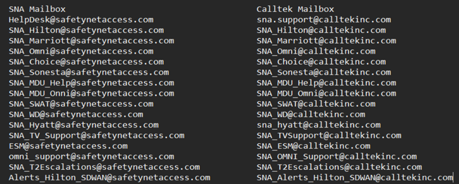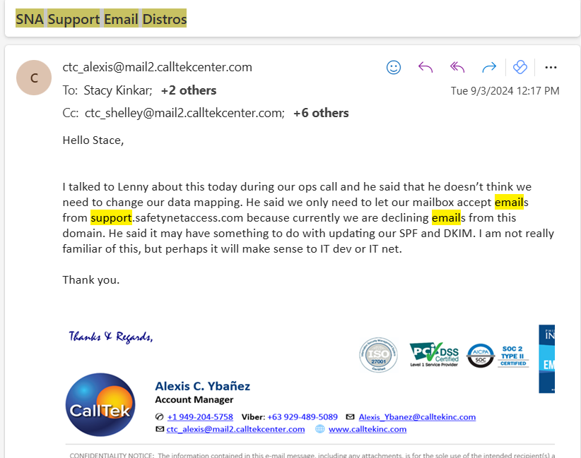 Per Lenny, the domain of all support email distros will be changed to support.safetynetaccess.com. That is why Lenny initially asked for CTC mailbox to forward emails from this domain. Team confirmed with him, he mentioned that all distros will be changed to this domain.